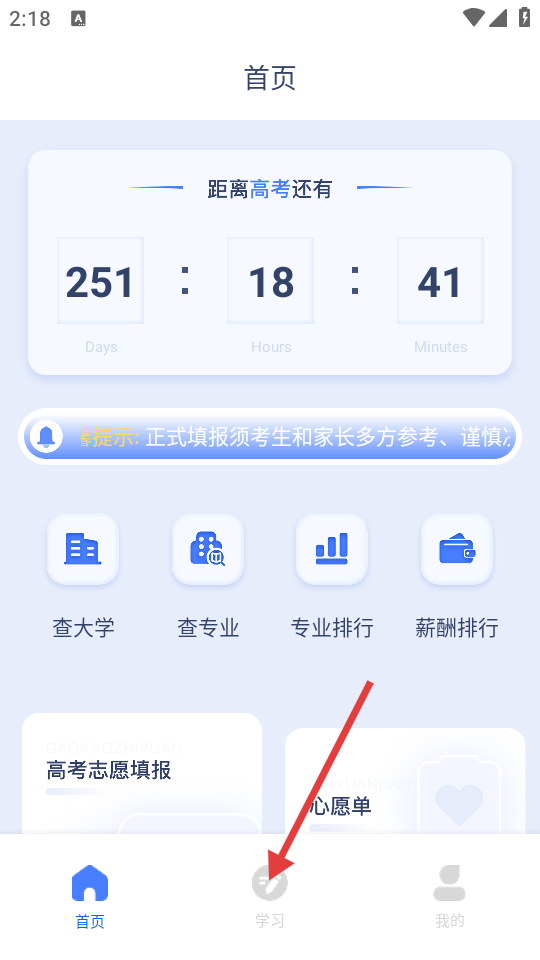 1、在首页,点击底部导航栏中的【学习】按钮,进入学习页面。