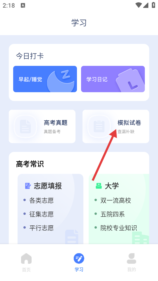 2、在【学习】页面中,找到【模拟试卷】选项,点击进入模拟试卷页面。
