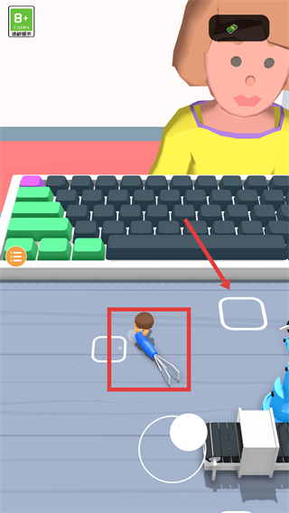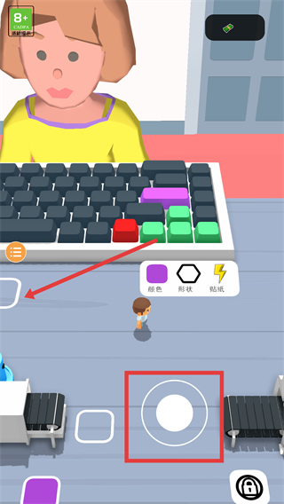 1、操控红框内的虚拟摇杆移动小人,靠近键盘区域,准备收集键盘按键,推进关卡进程。