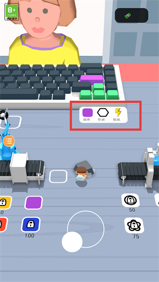 3、收集对应按键后,将其匹配到红框内的【颜色】【形状】【贴纸】分类区域进行制作。