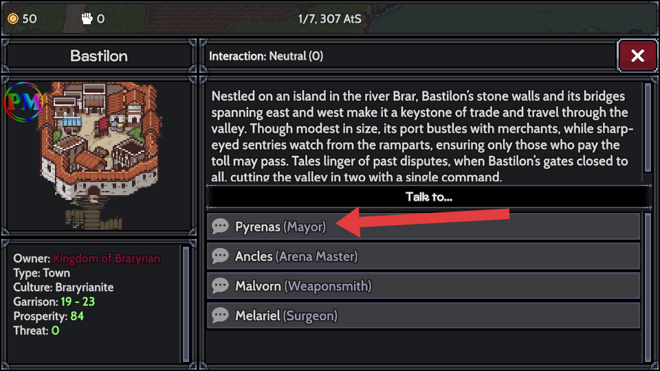 3、进入【Bastilon】城镇后,选择与【Pyrenas(Mayor)】对话,可获取城镇相关任务或信息。