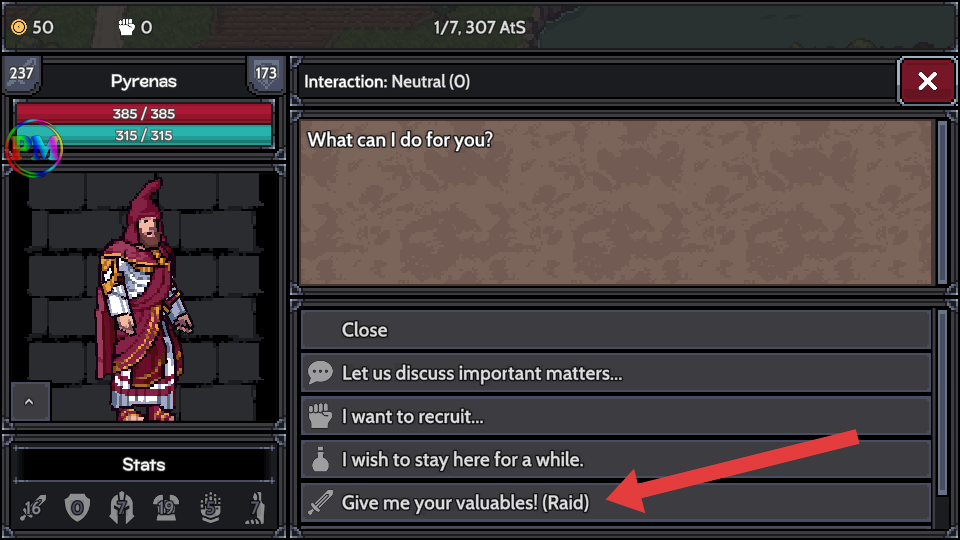 4、与【Pyrenas】对话时,选择【Give-me-your-valuables!(Raid)】选项,可触发掠夺玩法获取资源。