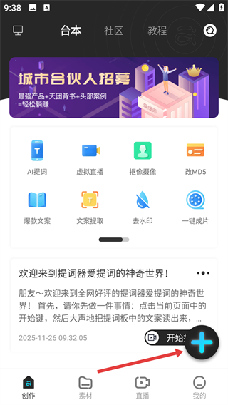 1、打开提词器爱提词,进入创作页,能看到【虚拟直播】等功能,点击右下角按键开始哦。