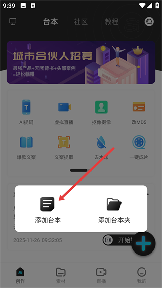 2、弹出选项后,我们可以选择【添加台本】来创建新台本啦。