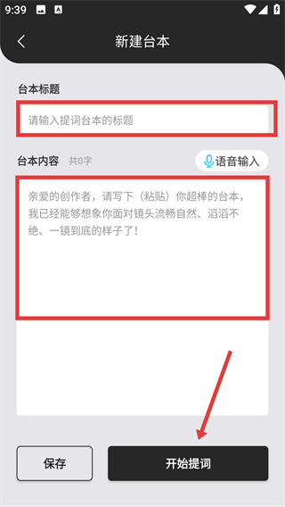 3、进入新建台本页,填写【台本标题】与【台本内容】,完成后点击【开始提词】吧。