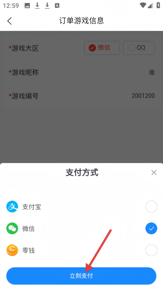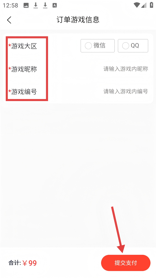 3、在订单游戏信息页面,填写【游戏大区】【游戏昵称】【游戏编号】,点击【提交支付】按钮。