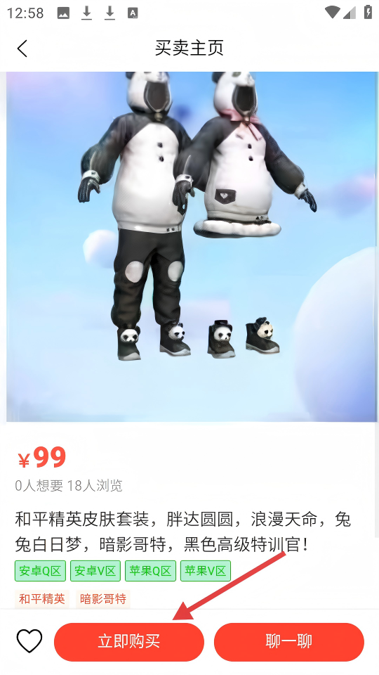 2、进入买卖主页后,若要购买该和平精英皮肤套装,点击【立即购买】按钮即可。