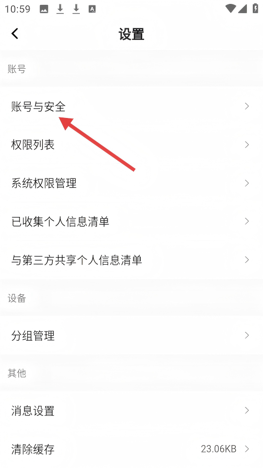 3、在【设置】页面,点击【账号与安全】选项,进入账号与安全页面。