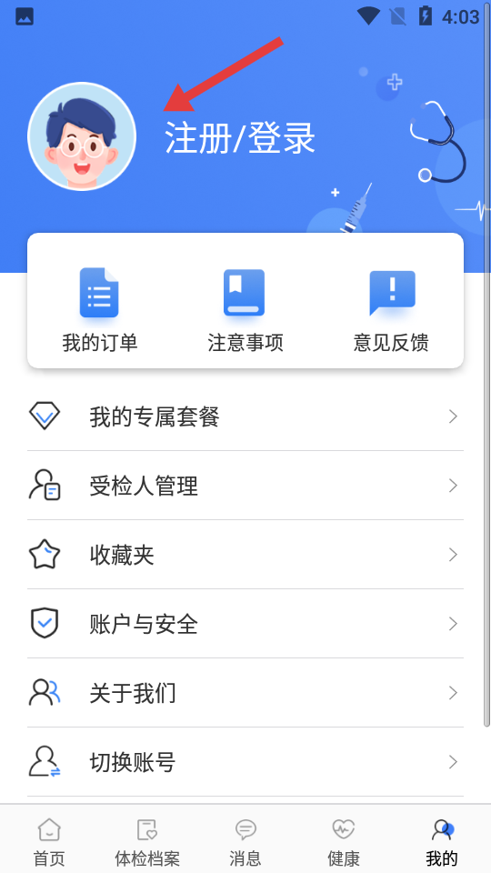 2、在个人页面点击【注册/登录】,进入登录选择界面。