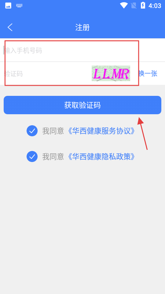 4、在注册页面输入手机号码和验证码,勾选同意协议后点击【获取验证码】,完成注册操作。