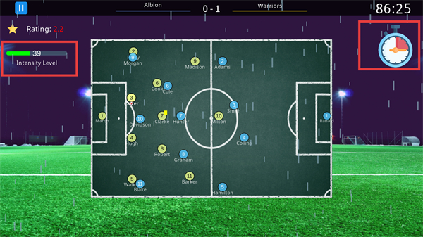 3、比赛后期(如第【86:25】分钟)需关注【Intensity-Level】数值(当前38),同时通过计时器把控补时等时间环节。