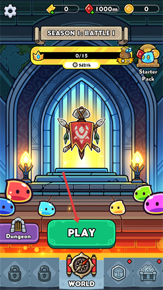 1、在【SEASON-1:BATTLE-1】界面,点击下方的【PLAY】按钮,即可进入战斗关卡,开启史莱姆对战。