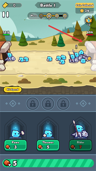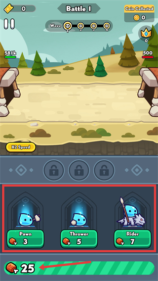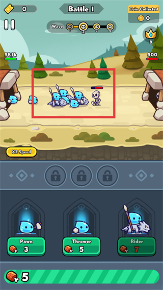 2、战斗前选择兵种:消耗对应资源召唤【Pawn-3】【Thrower-5】【Rider-7】,组建史莱姆作战队伍。