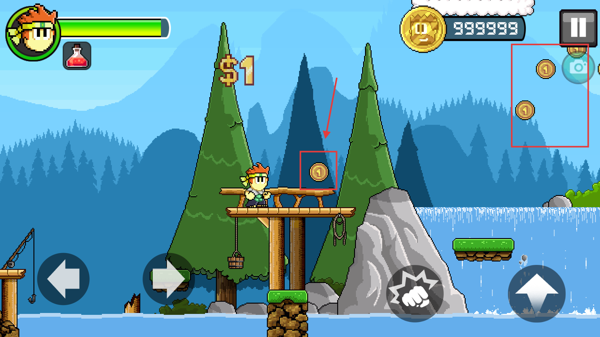 2、操控角色跳跃平台,收集场景中的【金币】,积累足够金币可用于升级武器,增强武器的杀伤力。