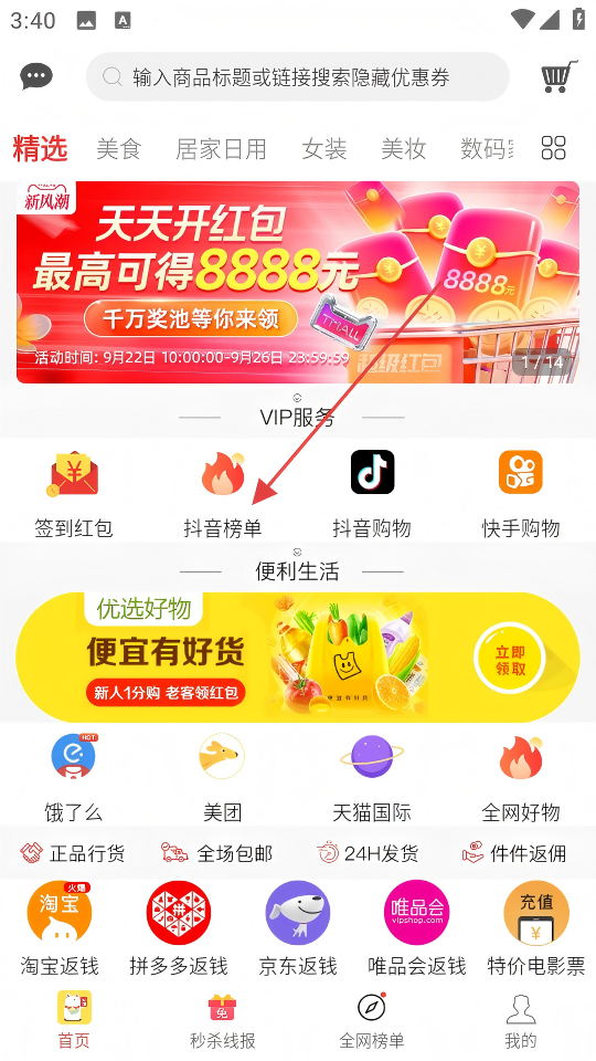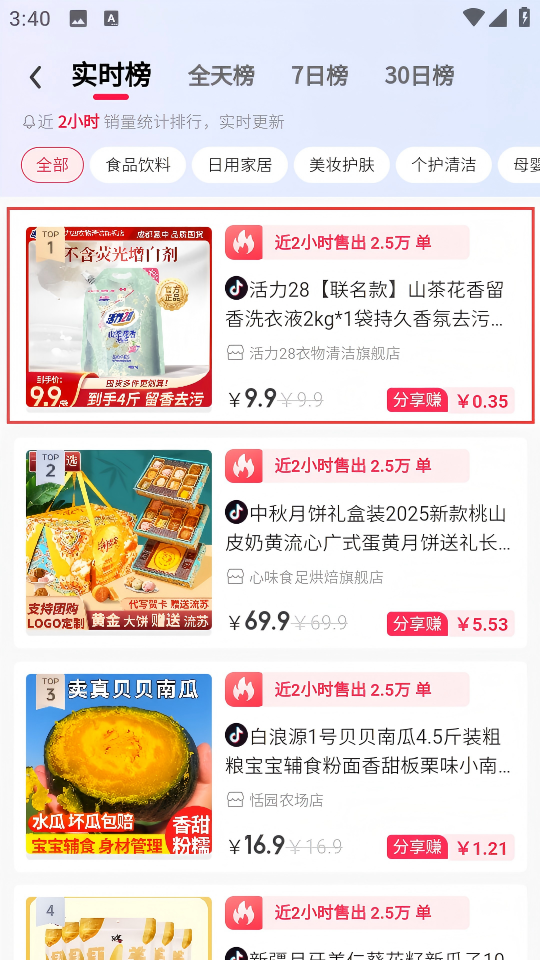 1、在首页点击【抖音榜单】,进入商品榜单页面,可查看各类实时销量排行商品。