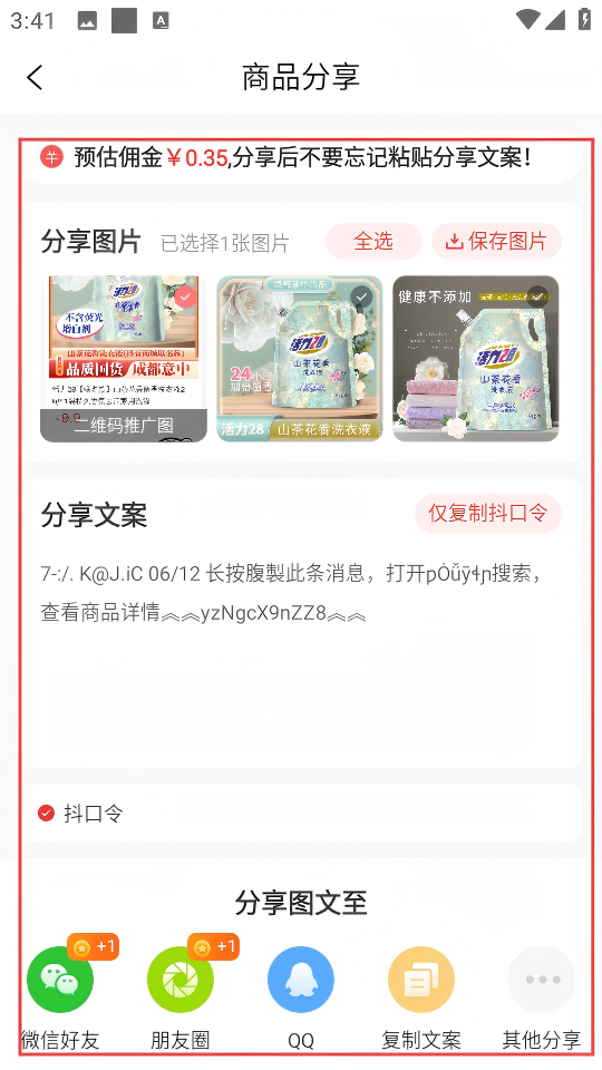 4、在商品分享页面,可选择分享图片、复制抖口令等,通过【微信好友】【朋友圈】等渠道分享商品。