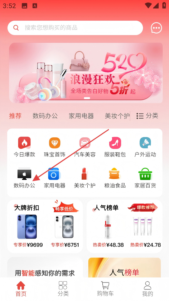 1、在首页点击【数码办公】分类,进入数码办公类商品的列表页面。
