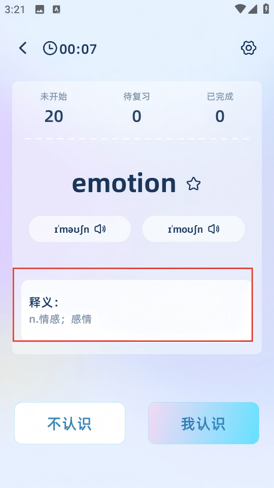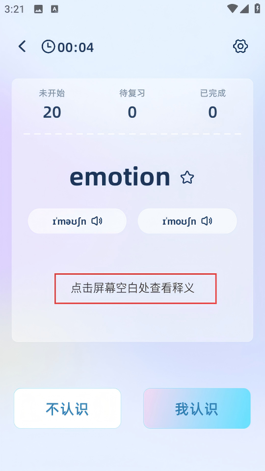 3、看到单词【emotion】后,点击屏幕空白处,查看该单词的释义。