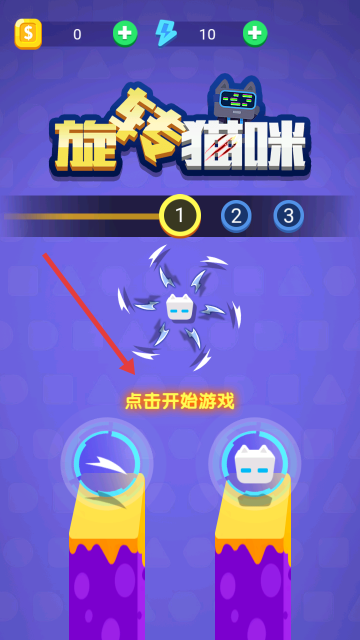 1、点击点击开始游戏,在格子场景操控旋转猫咪,开启击败黄色敌人同时收集金币的挑战。