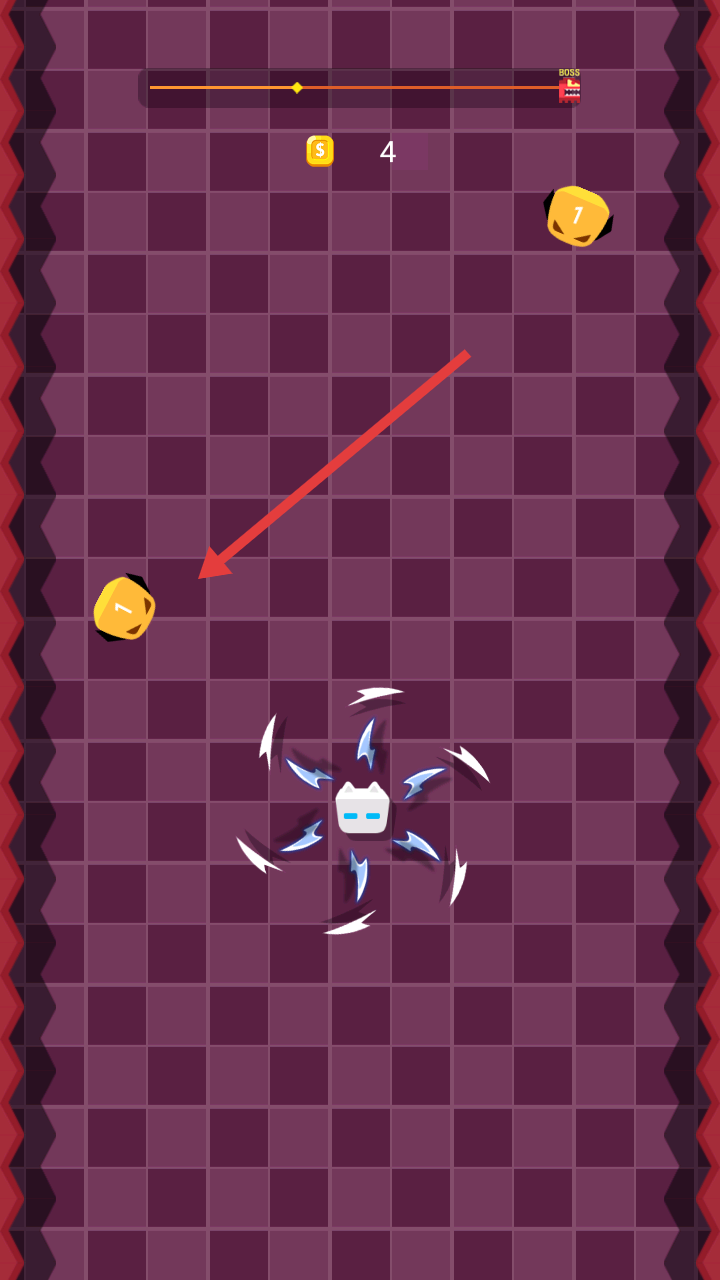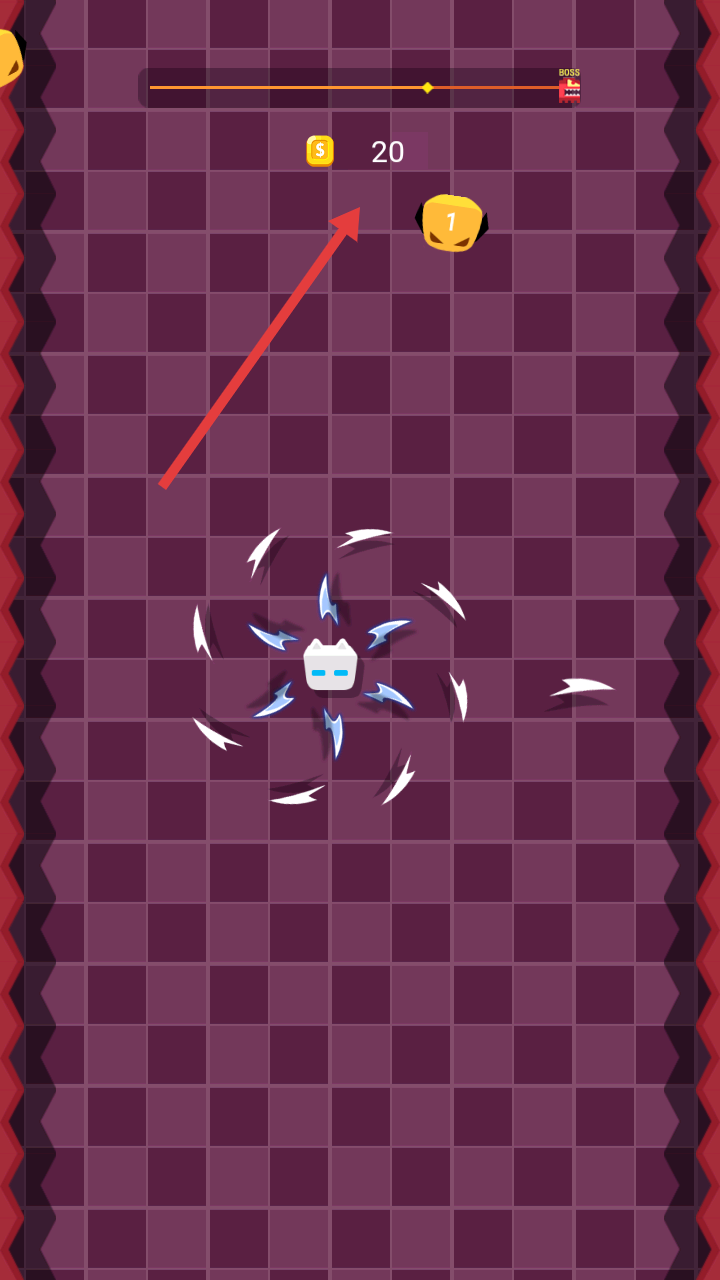 2、操控旋转猫咪移动,撞击黄色敌人将其击败,同时收集场景金币,积累资源与战斗进度。