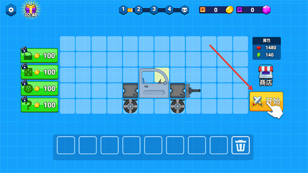 1、组装车辆后点击右侧【开始】按钮进入关卡,可先用左侧【100金币】选项强化零件提升属性。
