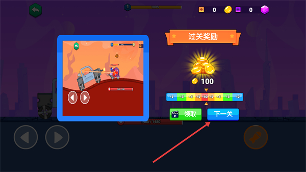 4、关卡完成后弹出【过关奖励】界面,领取【100金币】后点击【下一关】继续挑战新内容。
