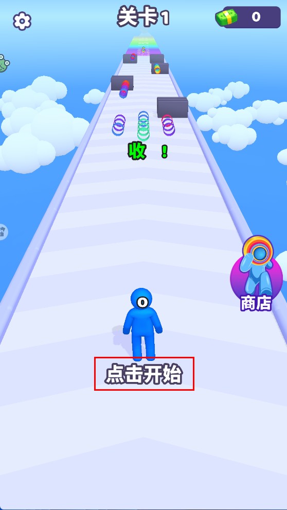 1、进入游戏后,点击【点击开始】按钮开启【关卡1】的挑战,右侧【商店】可后续解锁个性化圆圈形状。