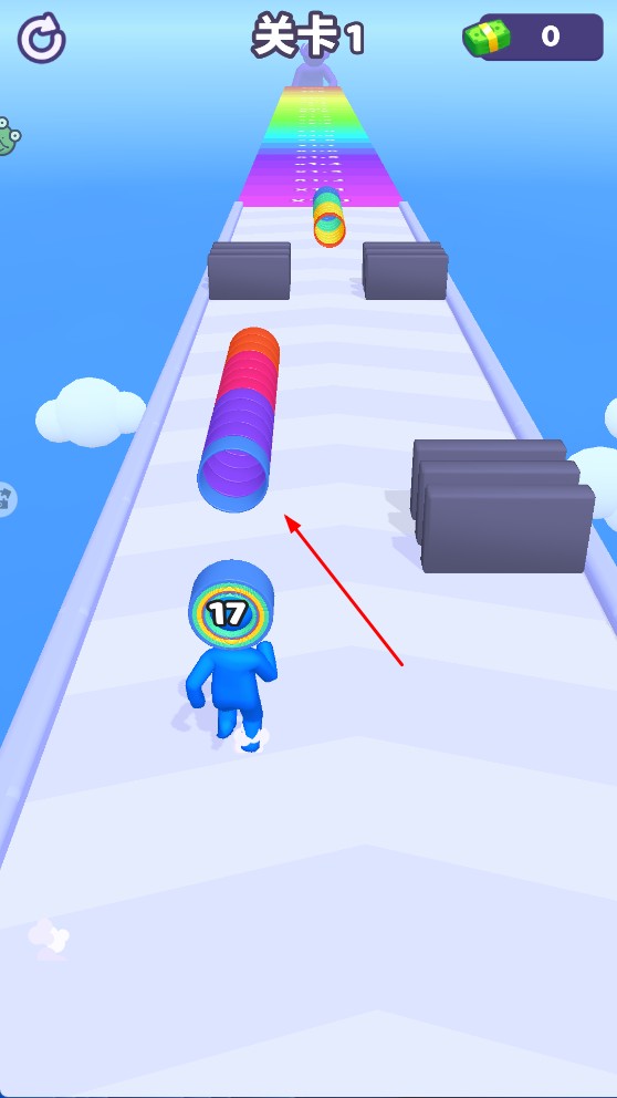 2、奔跑时需收集跑道上的【彩色圆圈堆】,提升头上【17】的数字等级,同时避开黑色障碍保成果。