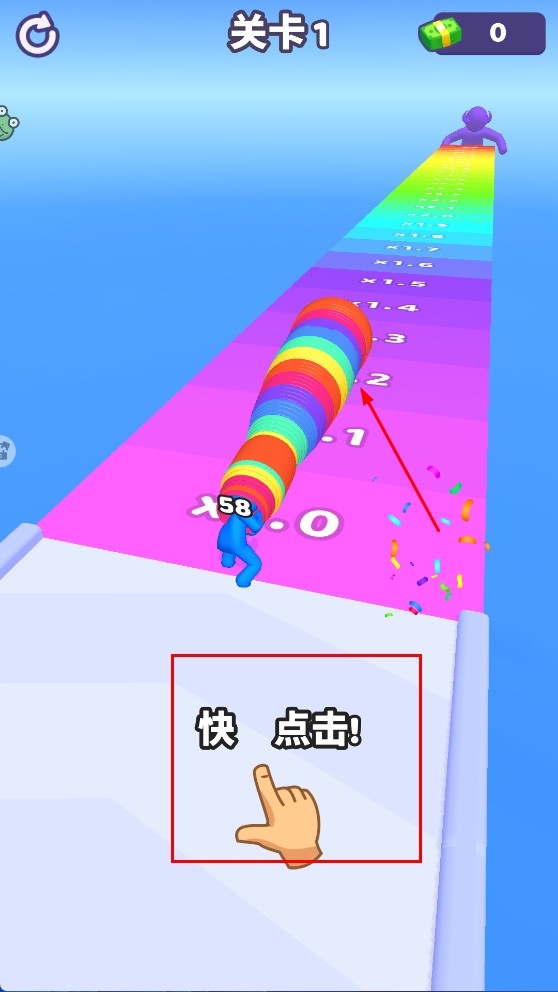 3、到达跑道终点前,快速点击屏幕触发【x58】增益,让角色沿彩色跑道飞得更远获更多奖励。