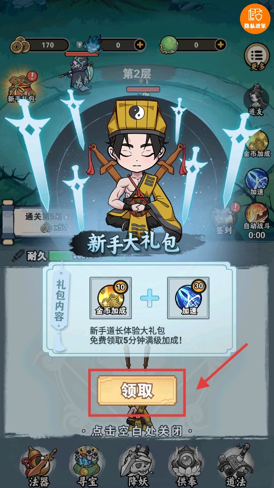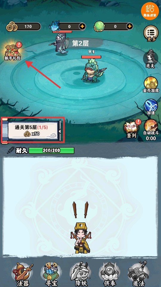 1、可点击【新手礼包】领福利,推进【通关第5层(1/5)】任务,获取金币,注意【耐久】保持200满值。