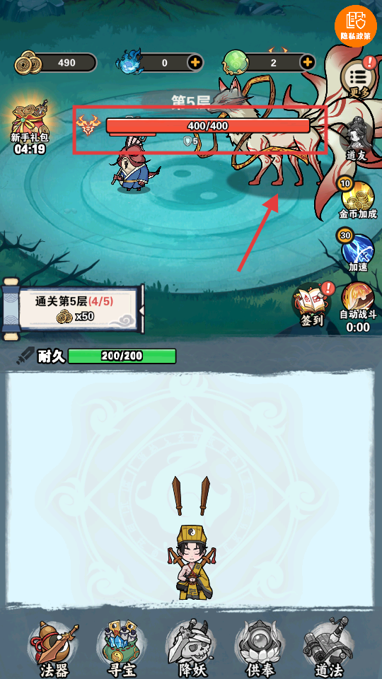 3、第5层战斗中,关注怪物【400/400】血量,配合技能击败,推进通关至【(4/5)】,积累资源。