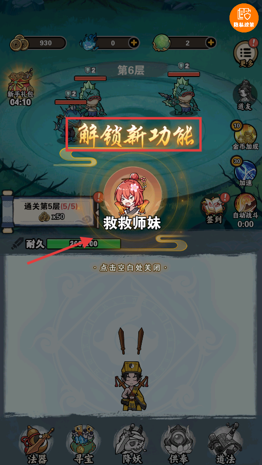 4、完成【通关第5层(5/5)】解锁新功能,触发【救救师妹】剧情,开启新玩法,可探索第6层。