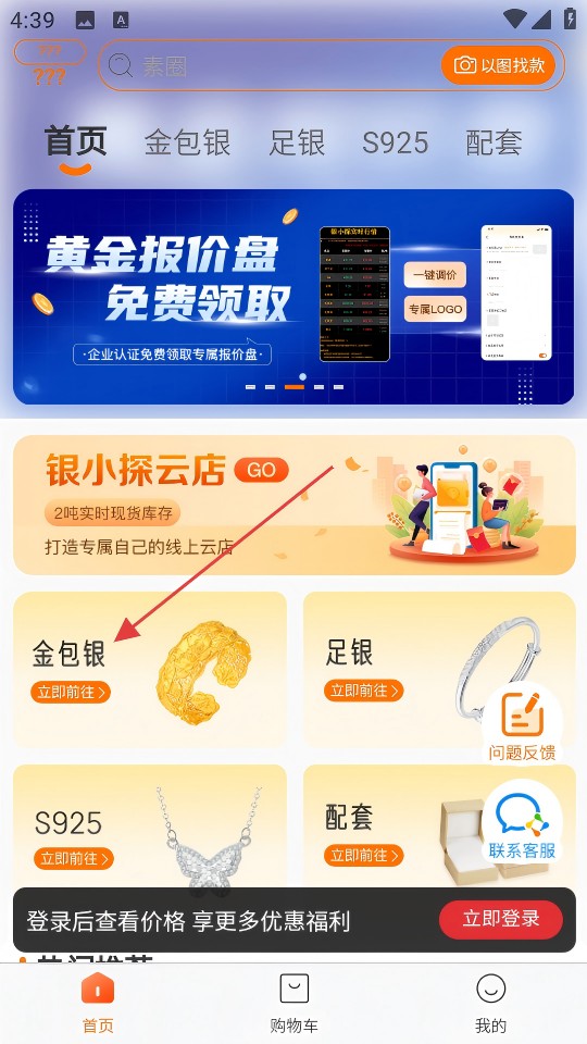 1、在首页点击【金包银】分类,进入金包银商品页面。