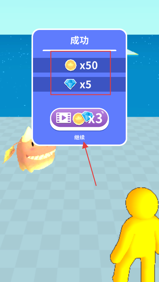 4、战斗成功后,领取【金币-50】和【钻石-5】,点击继续,破解版可无限获取资源养精灵。