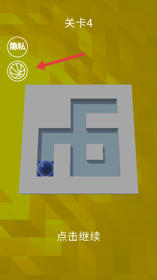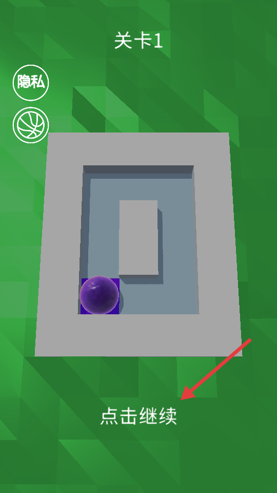 1、点击“关卡1”下方的【点击继续】,进入游戏,操控紫色球体在迷宫中移动。