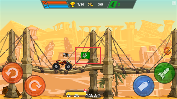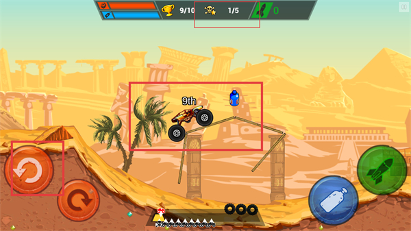 1、比赛中关注排名,操控怪物卡车在复杂赛道上行驶,提升排名。