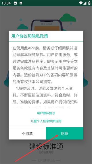 1、打开建设标准通APP,在用户协议弹窗中点击【同意】,进入主界面。