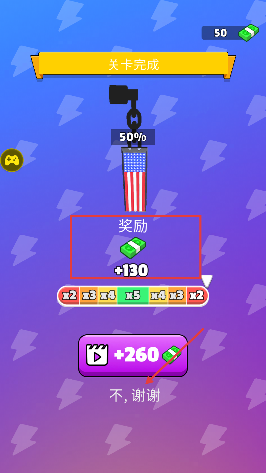 4、关卡完成后,领取奖励,或点击【不,谢谢】按钮继续。
