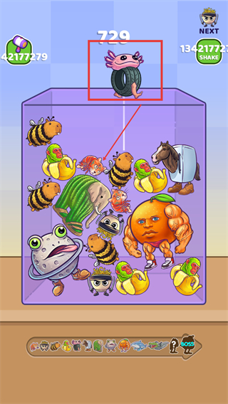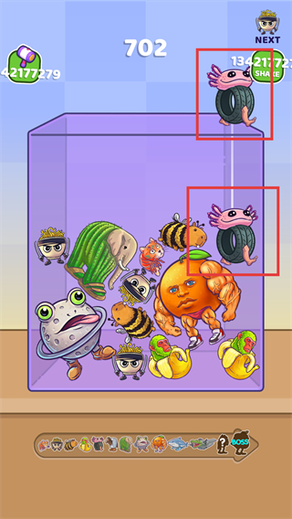 1、拖动相同的【轮胎粉色生物】到对应位置合成,能提升分数且解锁新的合成对象。
