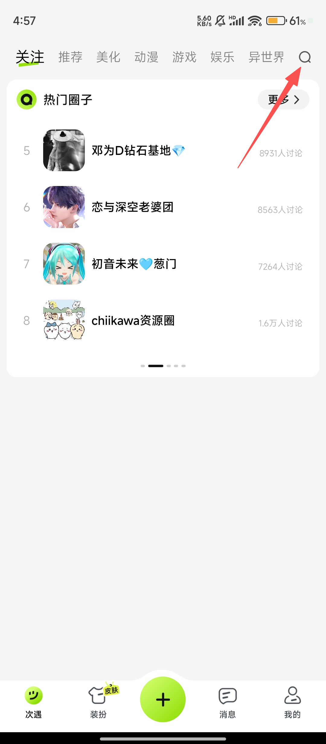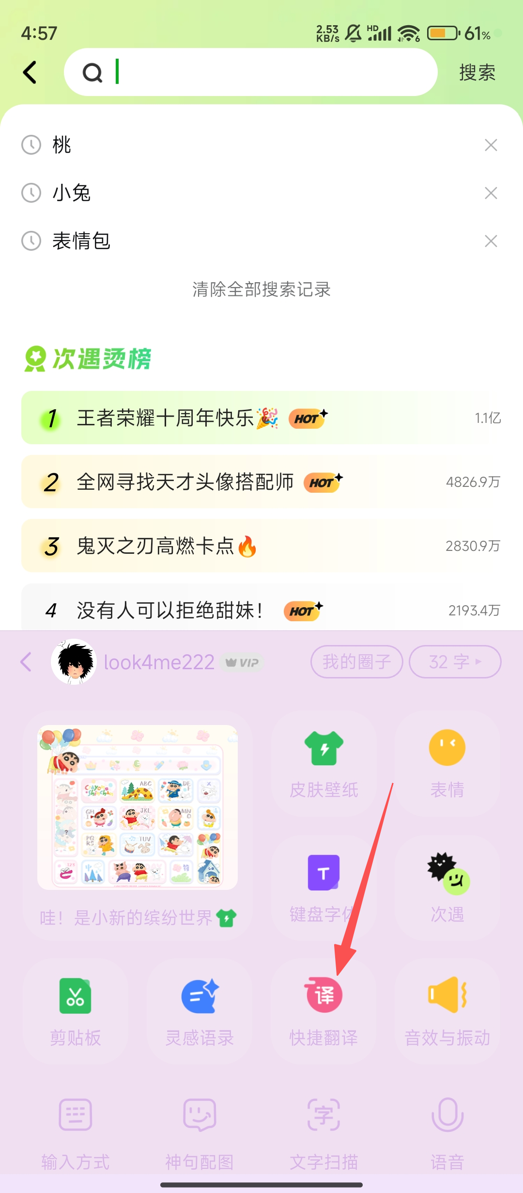 1、我们可以点击右上角搜索图标,进入搜索界面,进而找到快捷翻译的功能入口呢。
