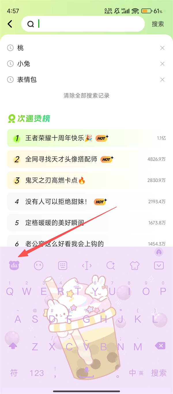 2、在搜索界面,点击键盘上的【百度】图标,展开输入法的功能选项哦。