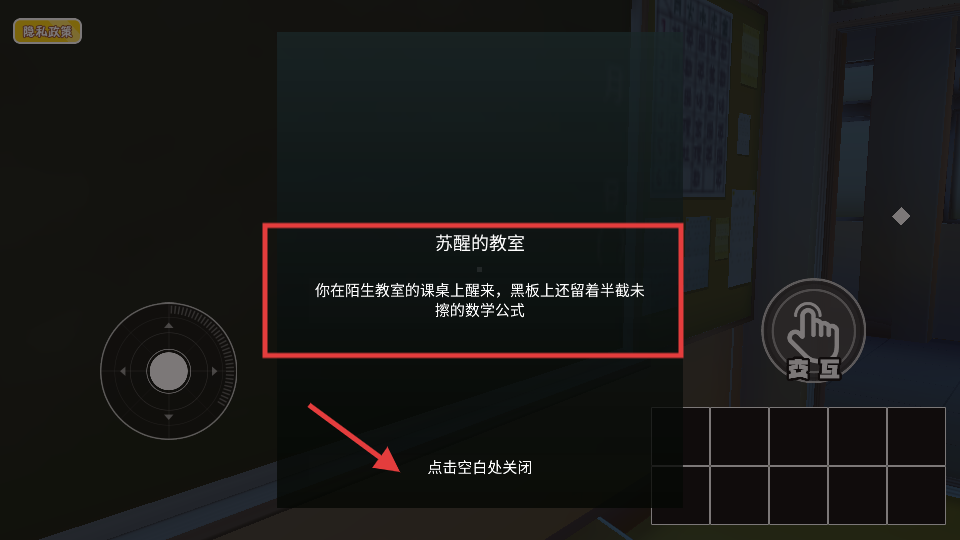4、阅读【苏醒的教室】剧情提示后,点击空白处关闭,明确场景背景与初始任务。