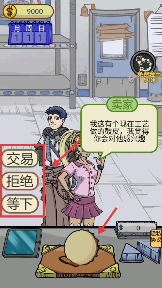 2、面对卖家推荐的“现在工艺做的鼓皮”,可从“交易”“拒绝”“等下”中选,这里选择进行交易。