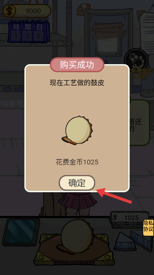 4、交易完成后,界面显示“购买成功”,花费1025金币得到“现在工艺做的鼓皮”,点击“确定”结束此次交易。