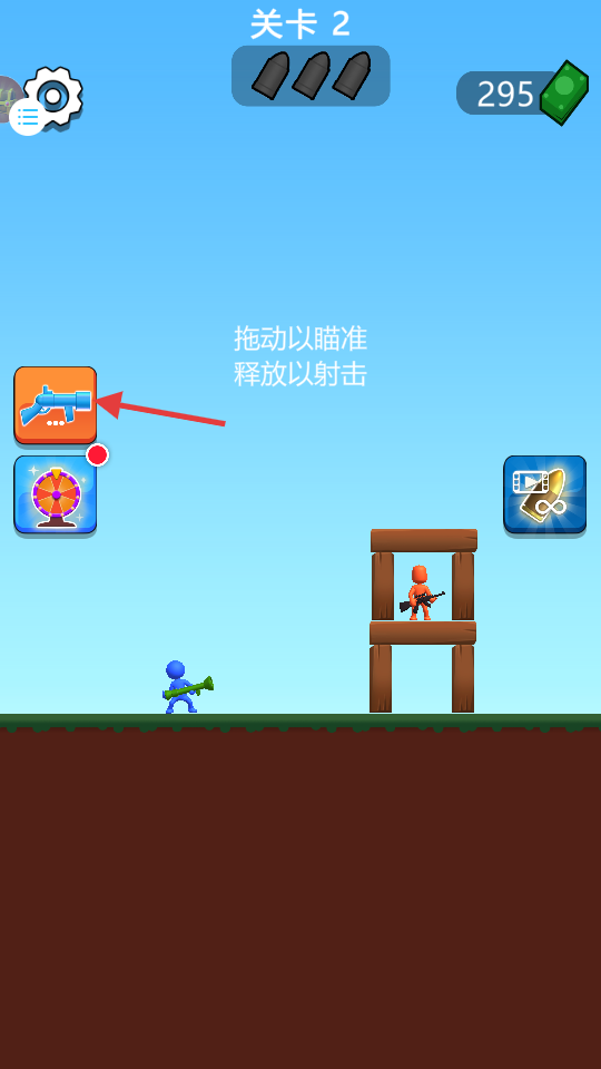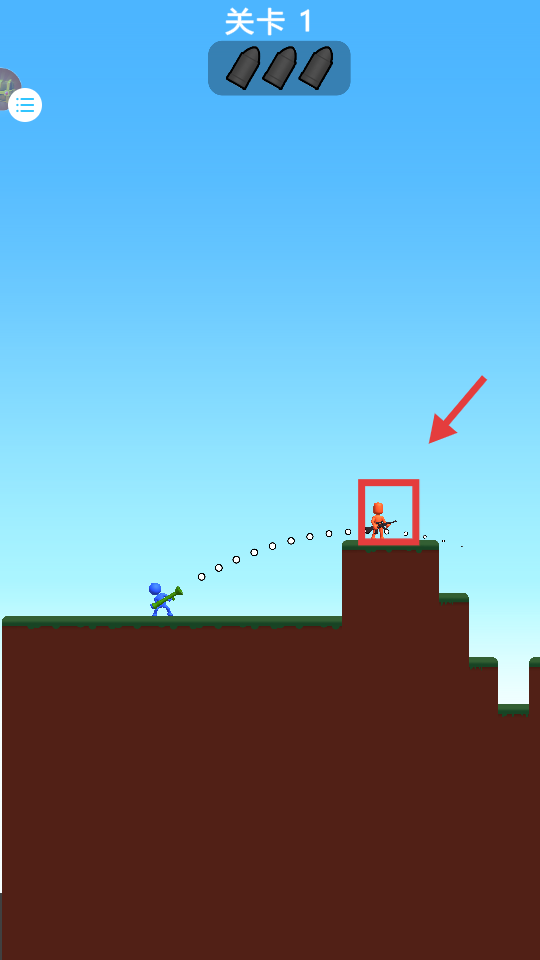1、在“关卡1”,操控蓝色角色,瞄准高处的橙色目标,发射武器攻击。