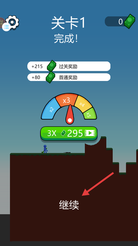 2、成功击败目标后,关卡完成,点击“继续”按钮,进入下一关。