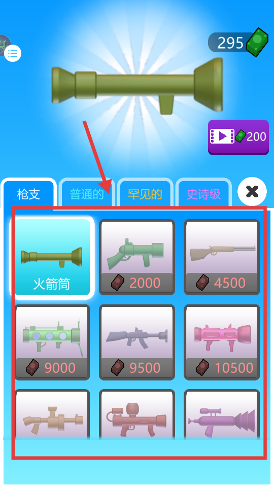 4、可在武器界面,选择“火箭筒”等枪械,增强攻击能力,助力闯关。