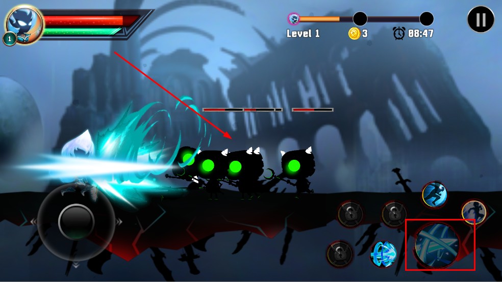 3、遇敌人时,点击右侧普攻/技能按钮,释放技能攻击,击败怪物。