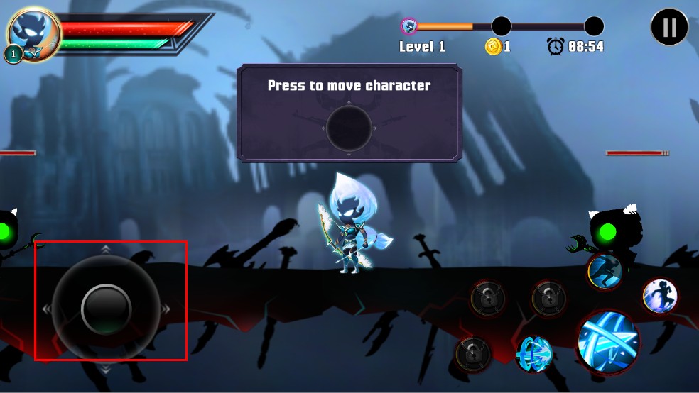 2、用左侧虚拟摇杆,控制角色在场景移动,探索关卡。