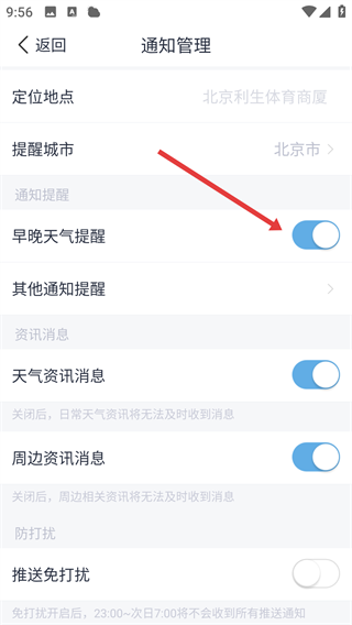 4、在【通知管理】页面,点击【早晚天气提醒】对应的开关,即可关闭该提醒啦。